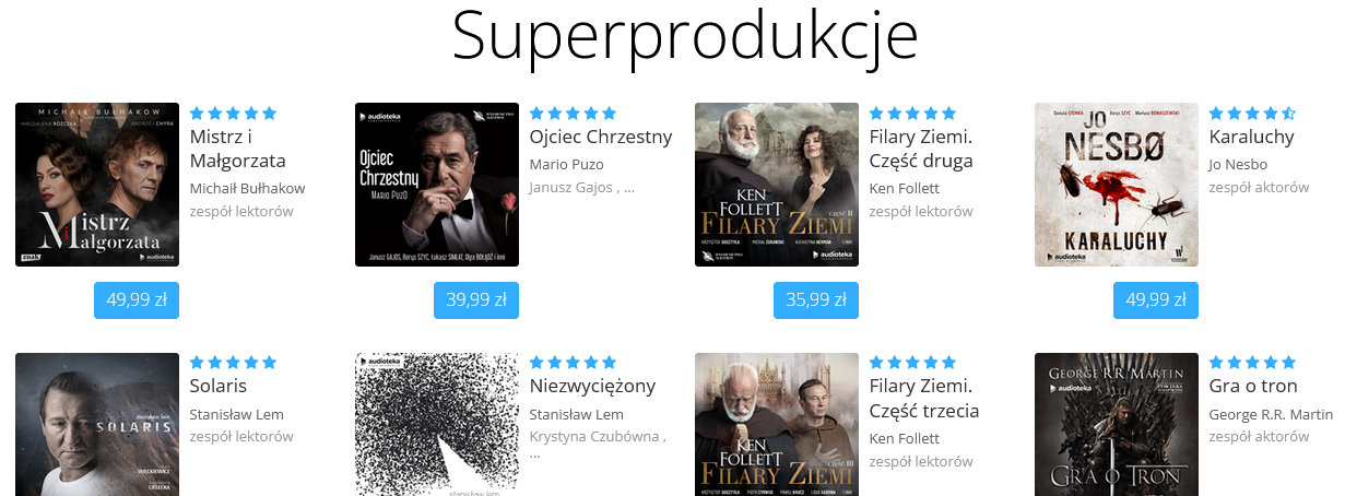 W tym artykule skupiam się tylko na audiobookach wydanych w profesjonalny sposób, gdzie głosów bohaterom udzielają zawodowi aktorzy. Nie biorę pod uwagę i nie polecam produkcji amatorskich lub odtwarzania ebooka za pomocą syntetycznego głosu robota. Na dobrego audiobooka składa się nie tylko dobra historia ale musi ona być również odpowiednio opowiedziana.